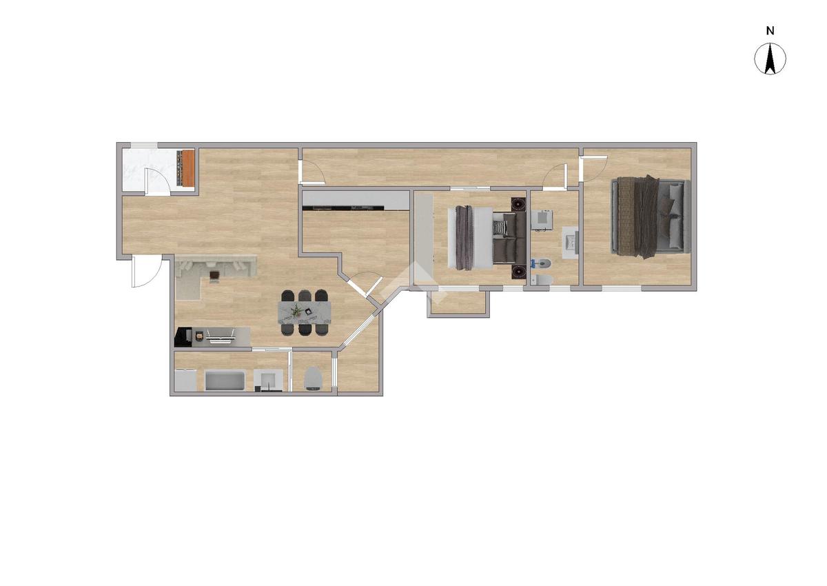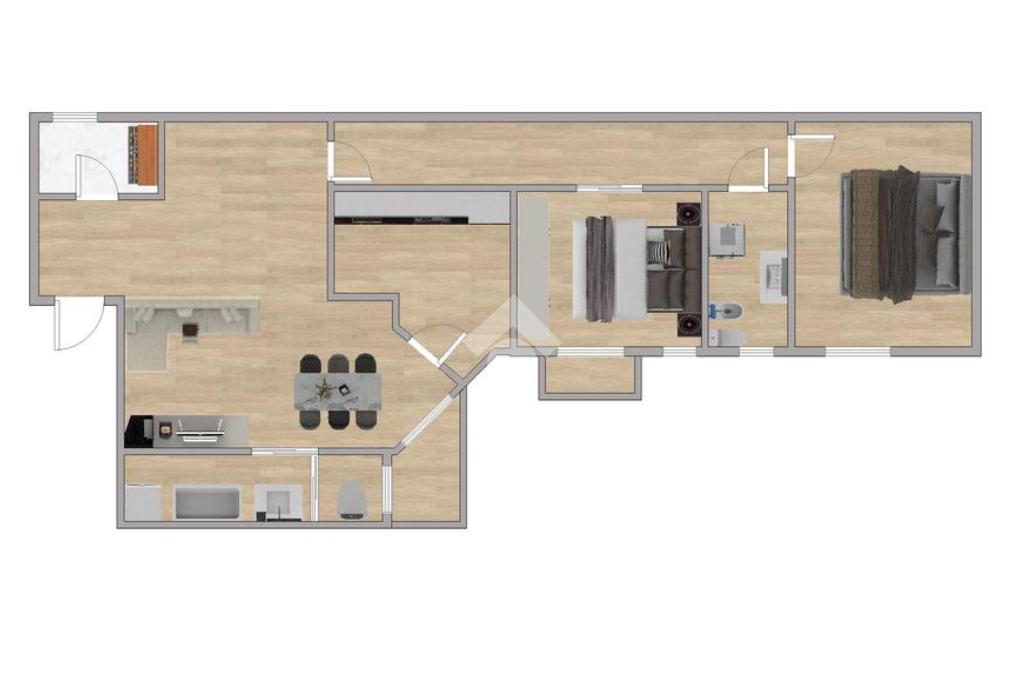 L’appartamento si distingue per la razionale distribuzione degli spazi: ingresso con comodo ripostiglio, ampia zona giorno con accesso al balcone, cucina abitabile separata, e due camere matrimoniali una finestrata e una dotata di balconcino privato.